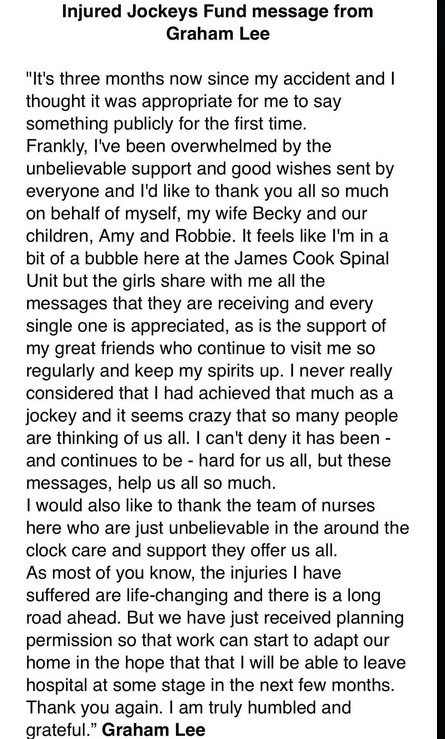 Graham Lee has been one of our Jockey Greats please support him and the Injured JockeyFund (Profitpunter)